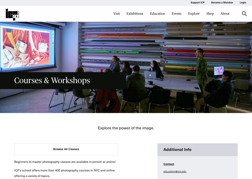 ICP offers workshops and masterclasses on documentary photography taught by experienced practitioners. These workshops cover a wide range of topics including storytelling, ethics, editing, and presentation.